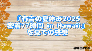 🌺ハワイの風 『有吉の夏休み2025 密着77時間 in Hawaii』を見ての感想 我が家は夫婦そろって『有吉の夏休み』の大・大・大ファンだ。一年で一番の楽しみと言っても過言ではない。私の選ぶ「Best of Hawaii TV show」だ!なので7月頃から情報公開をワクワクして、楽しみに待っている。今年もいよいよ「この... 2025.09.08 🌺ハワイの風